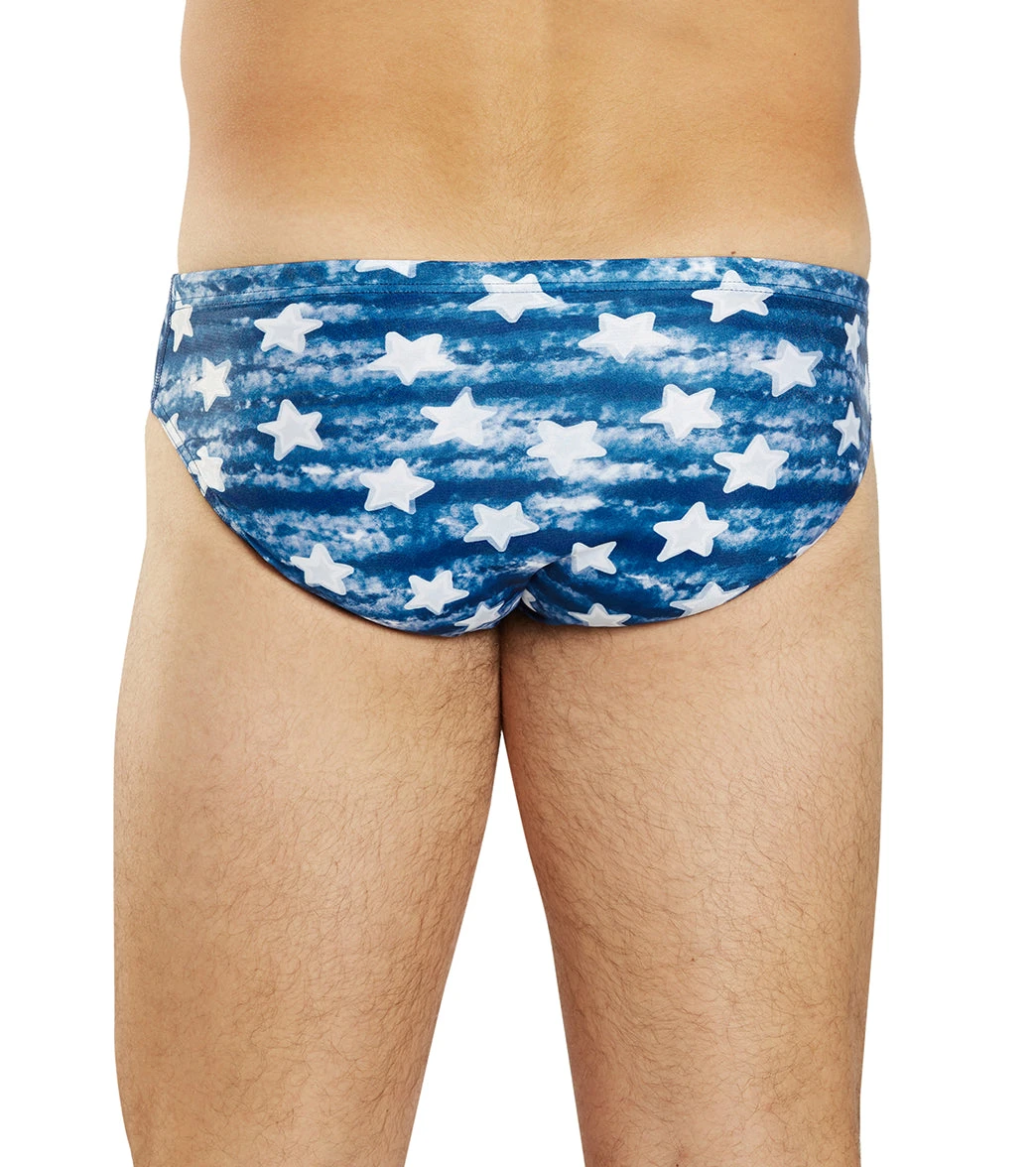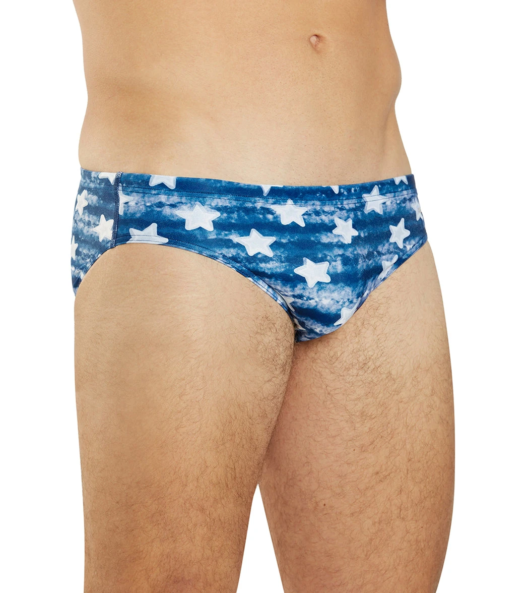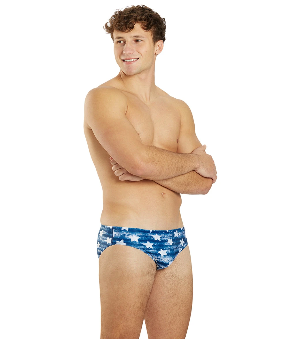 Embrace the American spirit with the Sporti x Alex & Gretchen Walsh Pool Star Brief Swimsuit. Its design features white watercolor stars on a blue colorwashed background, echoing the American flag. The drawcord waist ensures performance and comfort, making it a bold celebration of American resilience and unity.